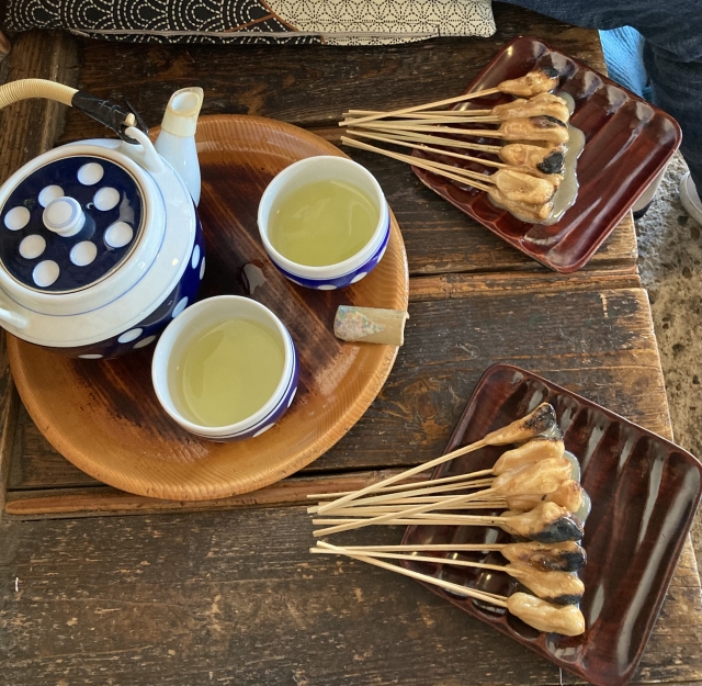 炭火であぶり甘い白味噌ダレをからめる